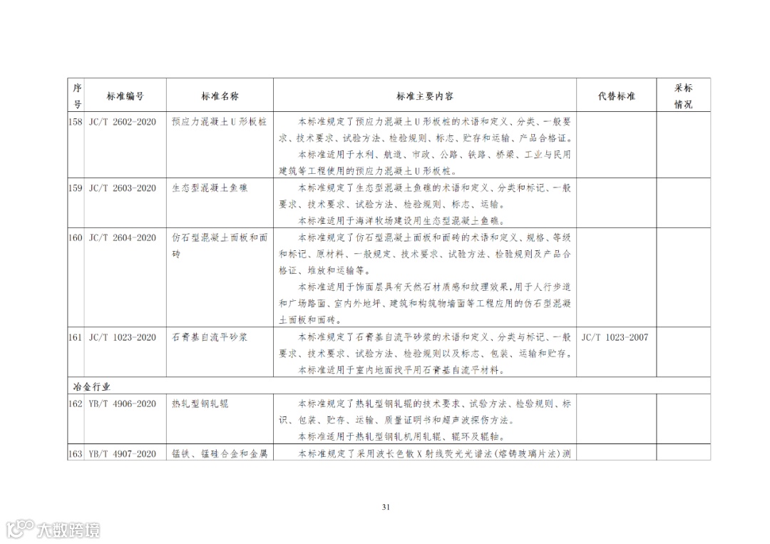 根据行业标准制修订计划,相关标准化技术组织已完成《工业用3-氯代苯酐》等95项化工行业标准、《垂直电梯曳引机用制动摩擦片》等66项建材行业标准、《热轧型钢轧辊》等25项冶金行业标准、《制浆造纸企业综合能耗计算细则》等14项轻工行业标准的制修订工作,以及《高碳钢盘条索氏体含量标准样品》等78项冶金行业标准样品的研制工作。