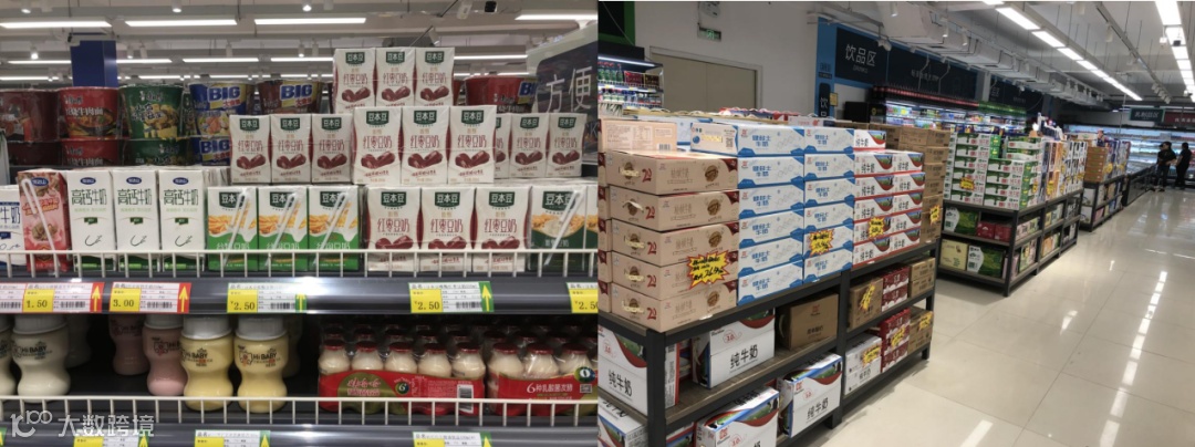 小型夫妻门店和小型超市中,液体豆奶铺货率为0;少数连锁便利店中会有散装维他奶的产品;中大型超市,有这类产品,但只有角落里有少量陈列,占比跟牛奶比几乎可以忽略。豆奶粉倒是十之六七都有货,但销量也并不理想。