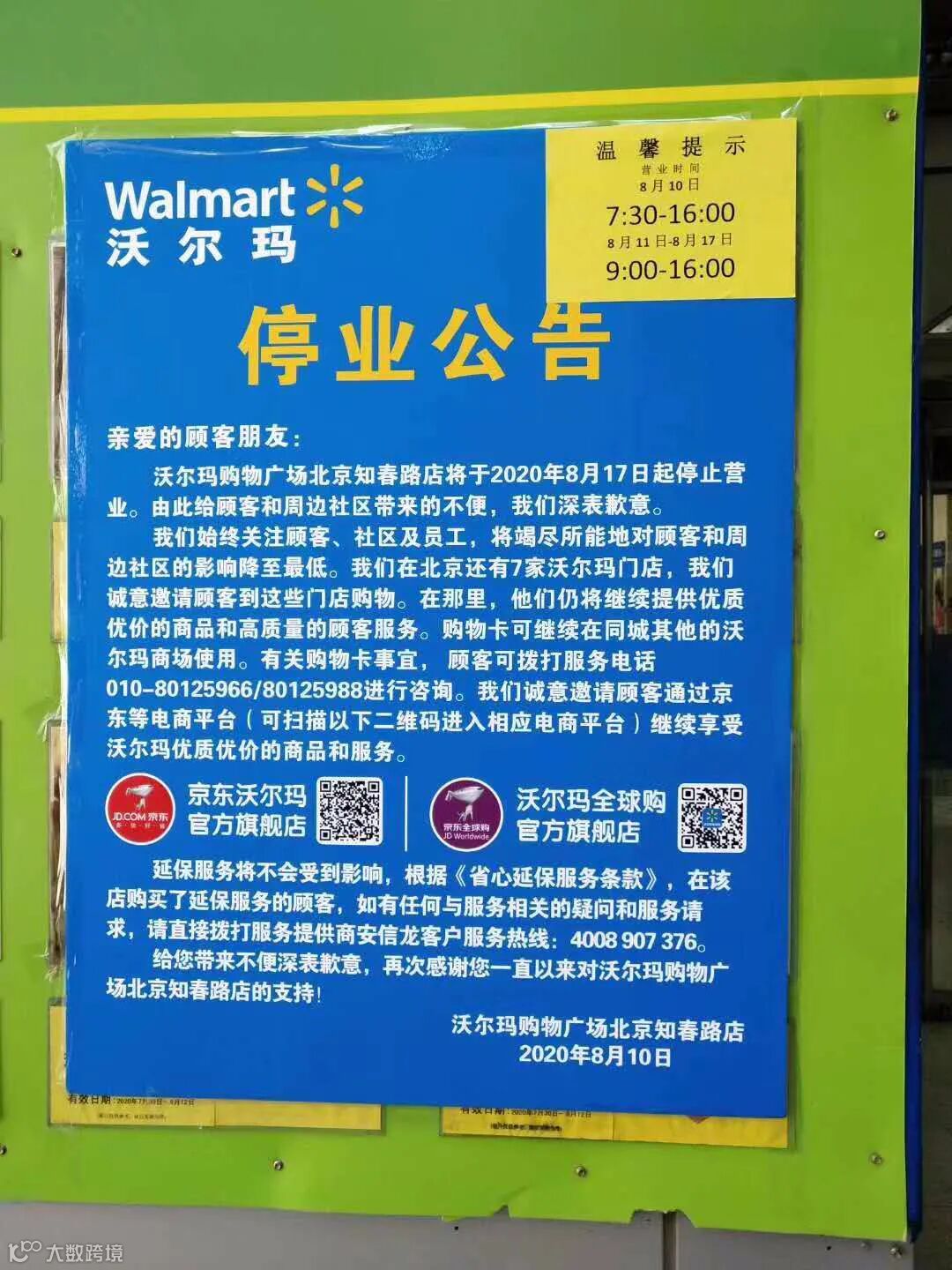 沃尔玛北京知春路店是一家老店,营业面积1.8万平方米,开业已有15年的时间。8月10日,这家店用一纸停业公告结束了其营业使命,没有给出闭店原因。保安告诉AI财经社:“门店到期,租金涨了太多,交不起了。”