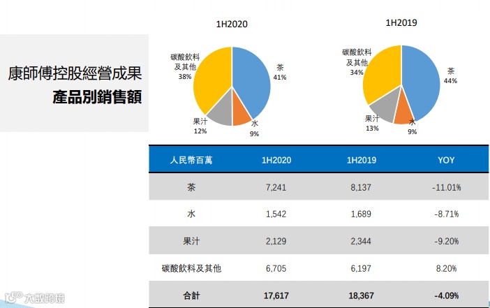 公告显示,2020年上半年,集团饮品业务业绩小幅下滑。饮品实业收益为176.17亿元,同比下降4.09%,占集团总收益53.49.%。