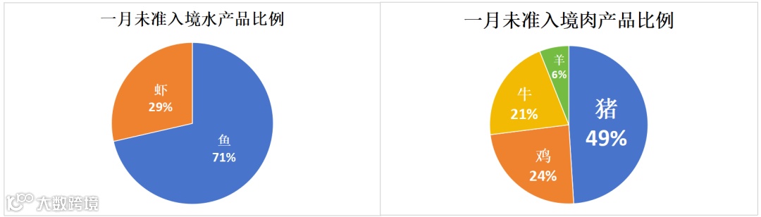 1月未准入境食品中, 水产品43批次(224.79吨) 、 肉类53批次(840.26吨) 占比最高,合计占总量近30%!
