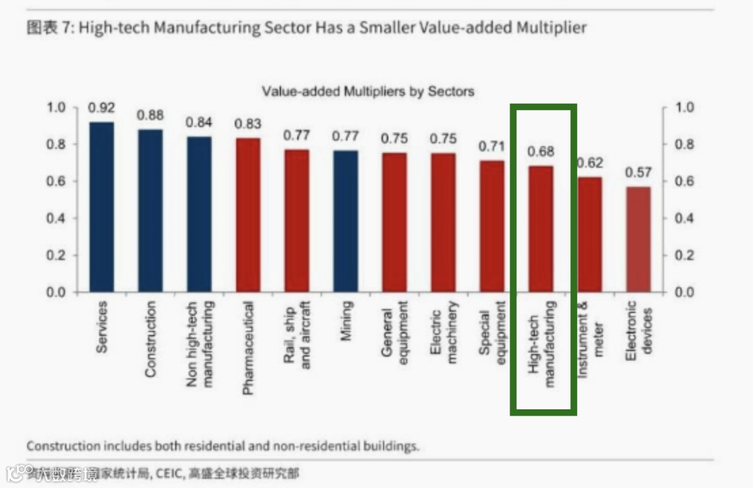虽然国产替代正在加速,但目前中国高技术制造业的附加值乘数仍然较低,仅为0.68。这意味着:每投入1元,该行业只能创造0.68元的经济附加值,远低于服务业的0.92元。