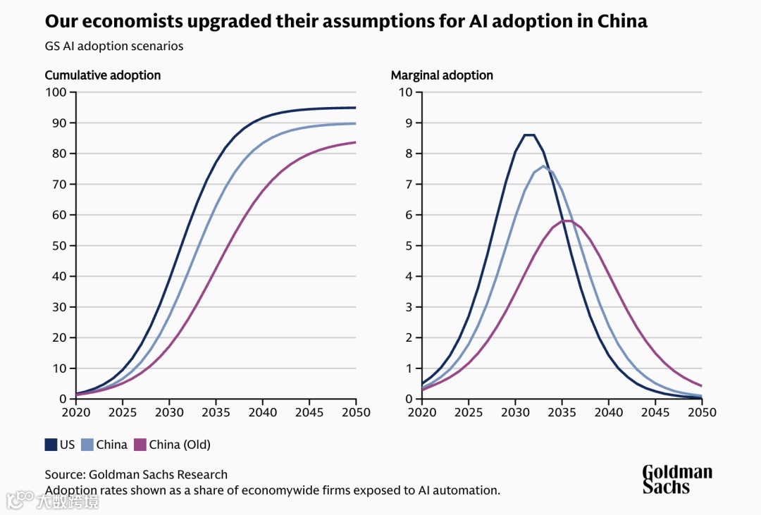 在另一篇文章中,高盛探讨了AI对中国经济的影响,并预计到2030年,中国人工智能的普及率将超过30%,并在2030年代初达到全面渗透。