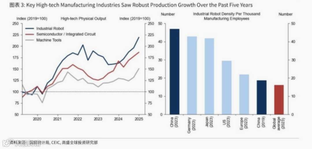其中工业机器人、精密机床、晶片等高端制造产品的产量更是大幅增长。2019年至2024年,工业机器人产量翻倍,机床产量增长50%。