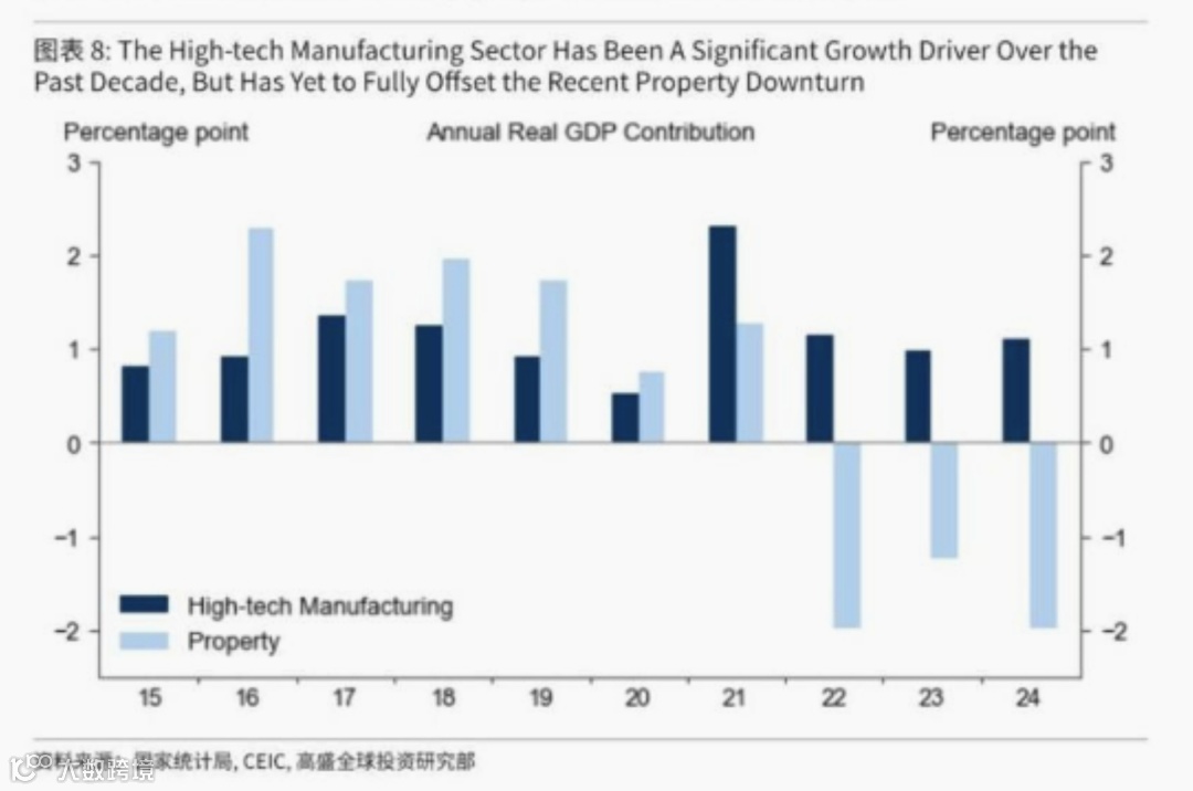 相比之下,高科技制造业的年均增长贡献预计在1.0个百分点左右,因此,即使高科技行业持续扩张,也难以完全填补房地产带来的缺口。换句话说,即便中国制造业升级成功,经济增长仍需依赖其他因素,例如消费复苏、服务业升级、以及全球市场需求的回暖等等。