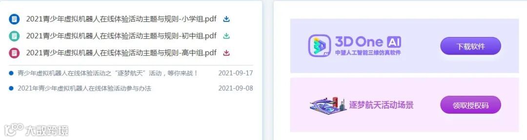完成注册后,点击左侧“参与活动”,选择第5项“逐梦航天”进入活动页面(或点击【阅读原文】),观看规则、学习视频及下载软件,体验在虚拟情景中模拟练习机器人操作,通过仿真平台完成虚拟活动任务。