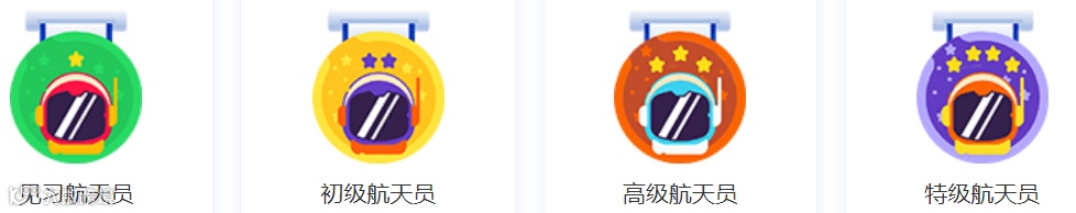 参加活动获取的积分越高,可领取的太空航天员等级勋章就越高哦!从见习航天员到特级航天员,注定是一个自我挑战的过程。