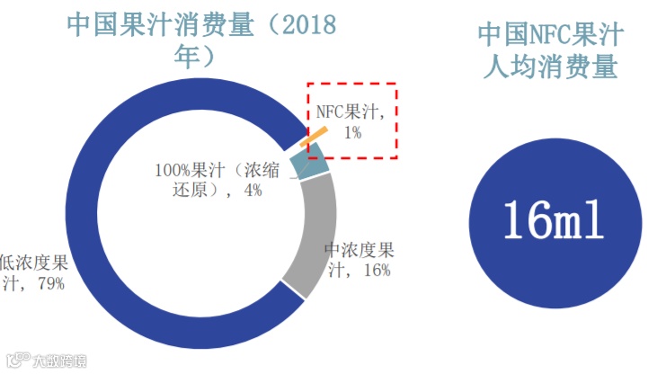 我国人均NFC果汁消费仅有16毫升,而邻国日本人均消费量超过2.5升,美国NFC果汁的人均消费量更是达到了10升。