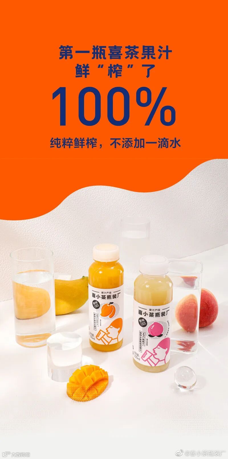 今年6月底,喜茶旗下子品牌喜小茶宣布推出第二个厂牌“喜小茶瓶装厂”,随即两款瓶装NFC果汁亮相。喜茶第一次涉足瓶装饮料,就选中了NFC果汁“出道”。