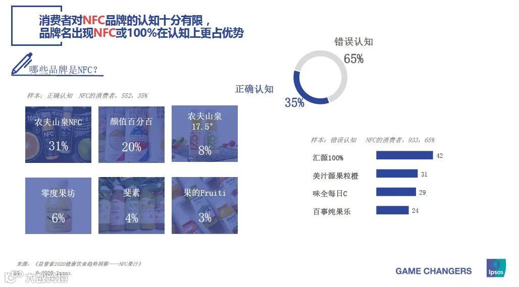 第二座山,NFC品类宣传不足。从益普索的调研数据可以看出,消费者对NFC果汁的正确认知仅有35%,他们对于其健康性认知,虽然高于FC果汁,但差异并不明显。而NFC果汁相较于FC果汁,其生产、运输、渠道等方面投入更大,成本更高。