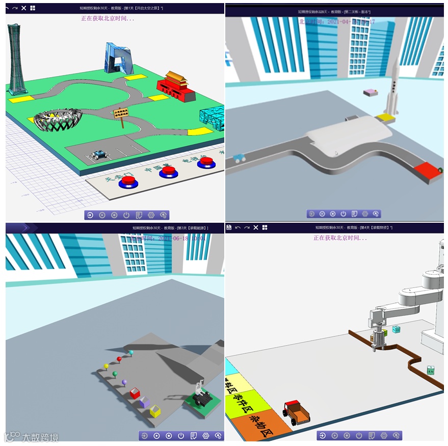 在3D One AI软件内进行程序编写:“控制”、“电子件”指令可完成运送车辆前行;“机械臂”指令可完成各类物资的分拣,每完成一个任务就会获得相应的分数,准备工作是不是非常简单轻松呢?