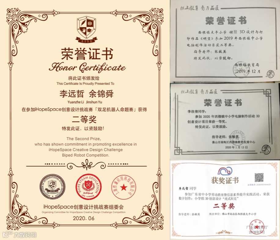 付出终有收获,通过积极参与科创实践活动与竞赛,同学们的3D设计水平得到很大的提升。至今,我校已有5位同学获得i3DOne社区“校园创客”称号,李远哲和余锦舜同学获得参“双足机器人命题赛”二等奖。
