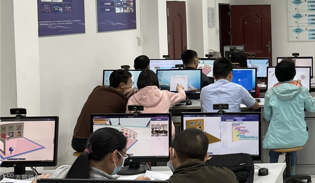 参会的老师跟随黄剑君老师的讲解与演示,在3D One AI软件内利用“图像识别”、“机器学习”等指令进行诗人识别,通过程序调试与仿真完成诗句显示......老师们在操作体验中上演着一场“飞花令大PK”,玩得不亦乐乎~