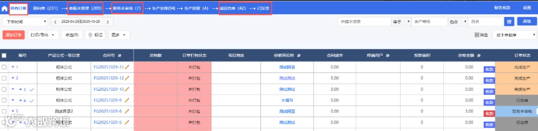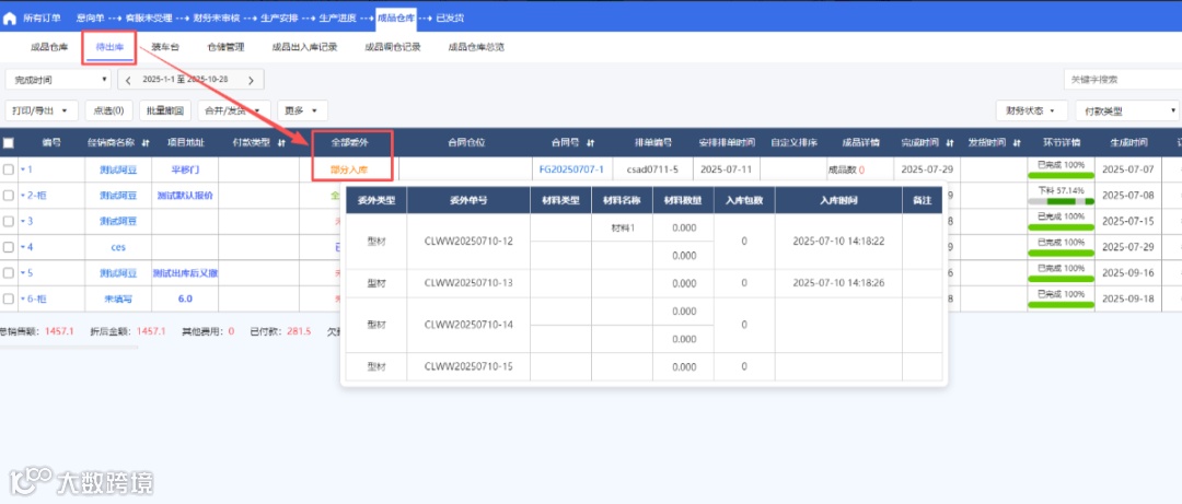2、成品仓库、待出库、已发货的组排头增加【全部委外】的排头,鼠标悬浮均可查看数据