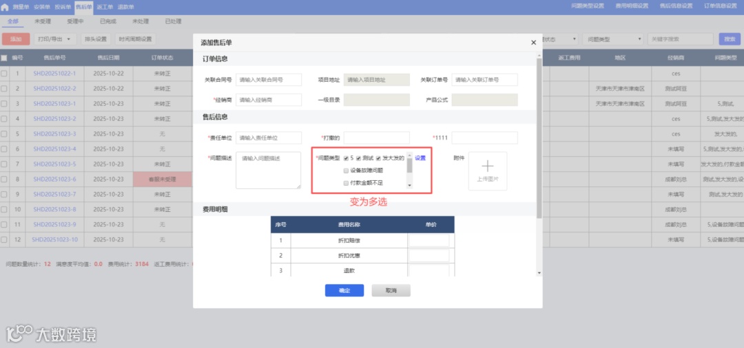 1、售后管理里面的问题类型同样更新为多选