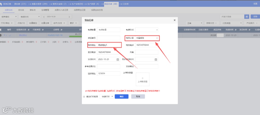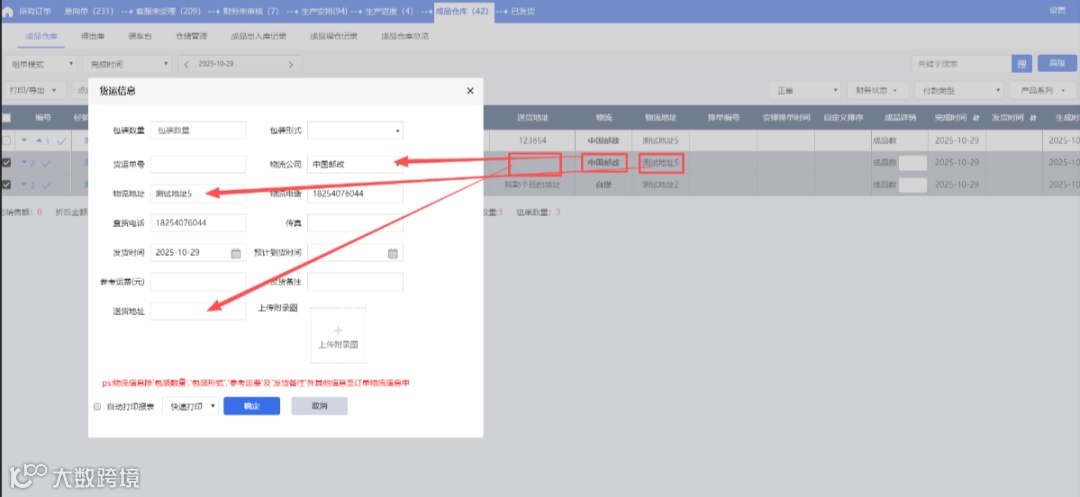 3、回传物流到合并发货的物流公司处,未做修改则保持当前,修改后显示最新的物流
