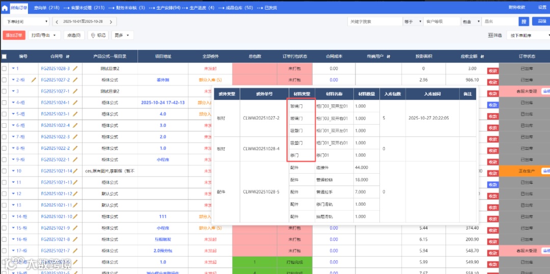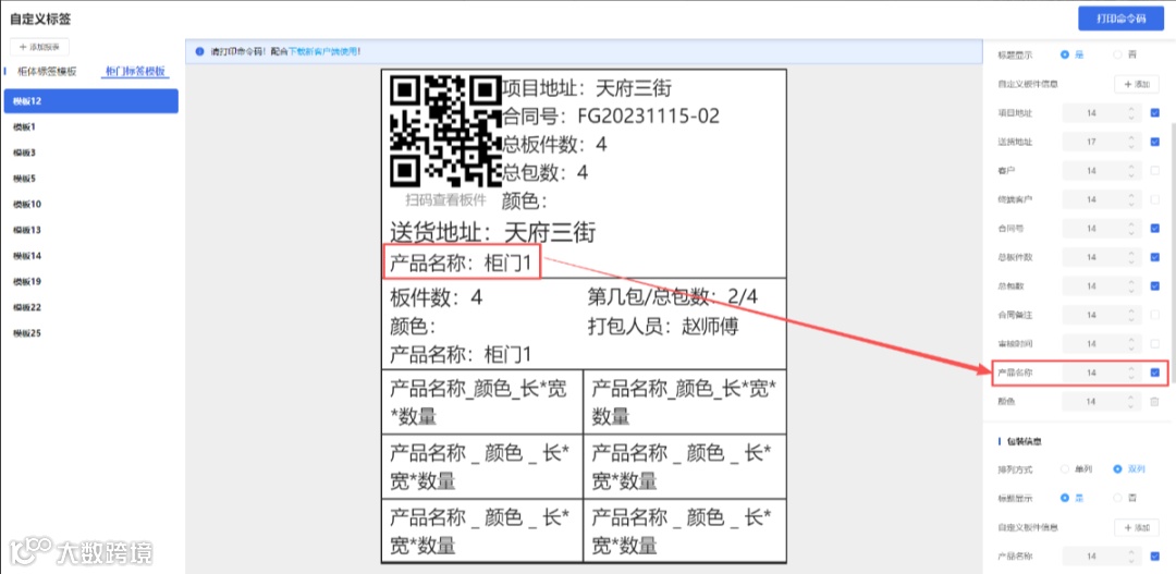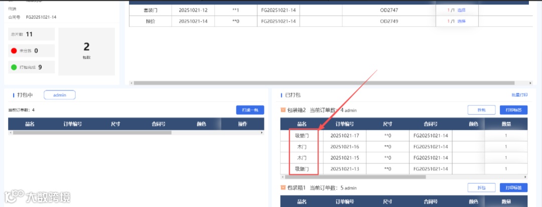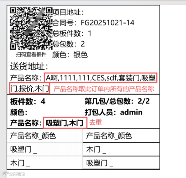 ③板件信息:颜色前面新增产品名称,当前打包板件/订单的所属产品名称,可以正常取消,系统数据;