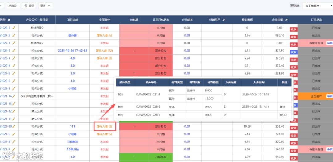 1、全部委外列表:【已发起】、【部分入库】、【全部入库】状态下鼠标悬浮,显示委外信息弹窗(包含委外类型、委外单号、材料类型、材料名称、材料数量、入库包数、入库时间、备注)