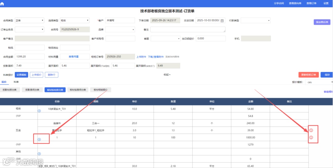 柜柜订单回传的报价表可以进行添加行和删除行: