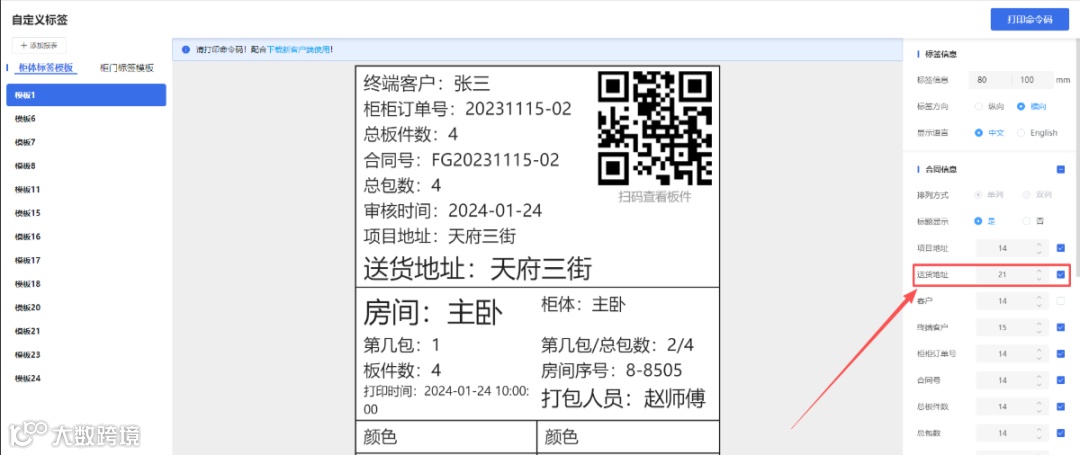 1、在合同项目地址下边,增加【送货地址】,取的是合同的送货地址值;送货地址柜门/柜体通用