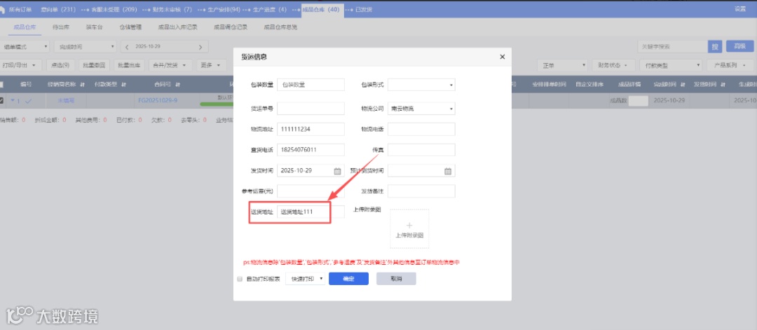 2、合并发货新增送货地址,自动回填下单时填写的送货地址