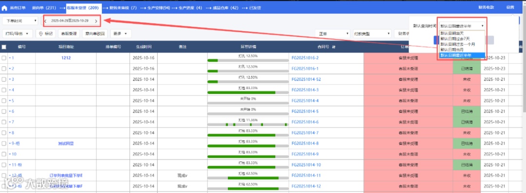 所有订单、客户未受理、财务未审核、成品仓库、已发货页面,订单表格数据默认查询时间段新增【默认日期最近半年】