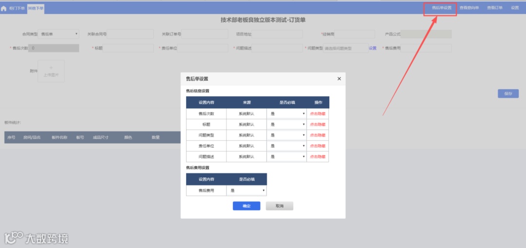 1、售后单下单页面右上角新增【售后单设置】,点击弹出弹窗:
