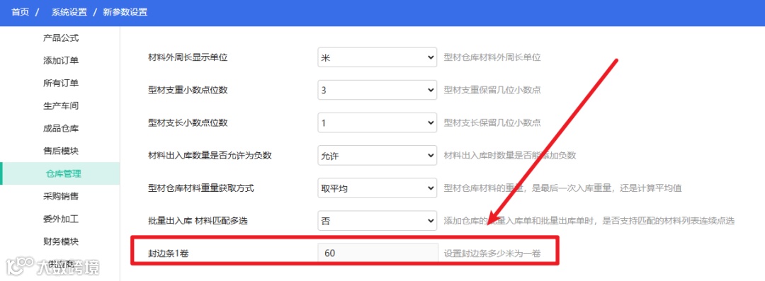 老板良-参数设置中,参数“封边条1卷”同步柜柜工艺设置中的“一卷封边的长度”,不支持修改同步节点:柜柜工艺设置-保存、进入老板良材料用量、柜柜采购单时同步