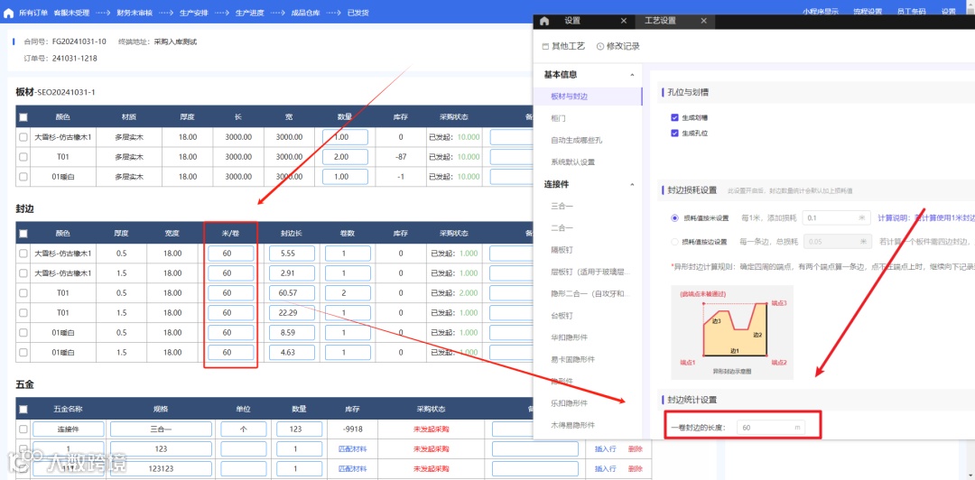 1、老板良-材料用量、柜柜采购单封边规格读取柜柜工艺设置中的“一卷封边的长度”