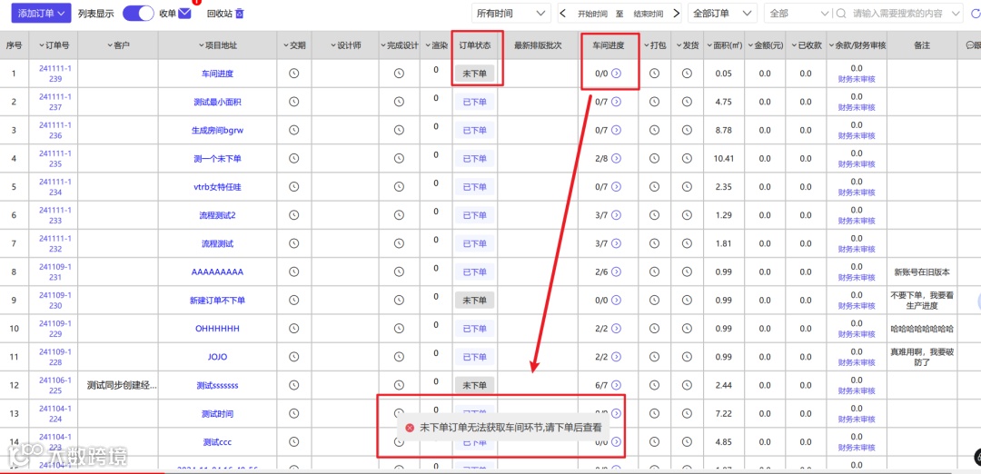 2)、未下单的订单,显示0/0,点击车间进度,并提示未下单