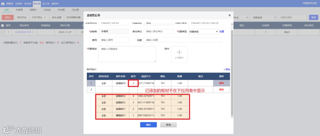 4、售后管理-售后单-添加售后单,添加过的板材不再在下拉列表中显示