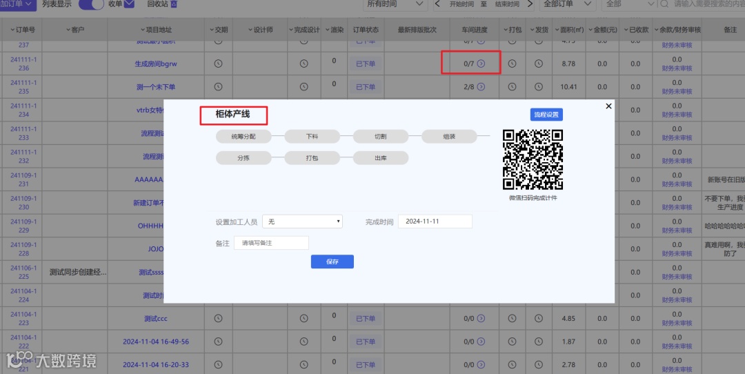 点击车间进度,弹窗显示该生产流程名称及具体环节,环节完成情况会相互同步。