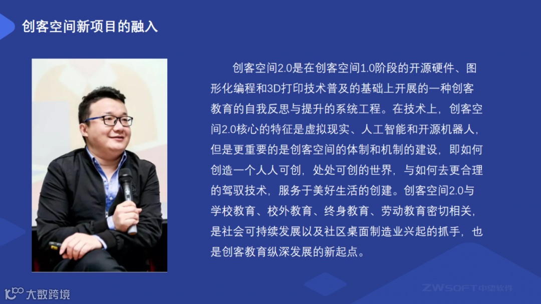 本次培训的两位大咖老师:创客研究专家吴俊杰老师和3D课程专家孙洪波老师进行线上面对面交谈,与大家一起聊一下创客空间的发展历程与背景,着重介绍如今创客空间2.0的精妙之处。创客空间2.0中机器人、电子硬件、趣味编程、AI软件等新项目的讲解让你大开眼界之余,还帮助你重新认识强大而与众不同的创客空间!相信看完此次培训的你一定收获不少!