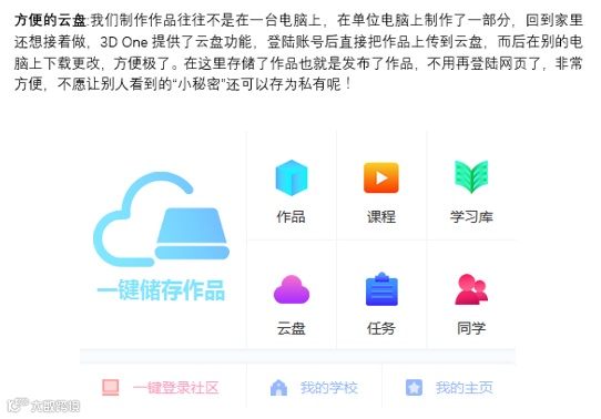 3D One教育版专属“社区管理”功能,有【学习】、【课堂】两大版块以及【一键存储作品】云盘小功能,将i3DOne社区众多优质教学资源和模型上传功能统统内嵌入软件里,互联网+3D创意新颖模式让自学或开课教学更方便快键。