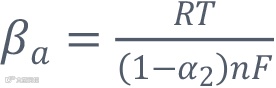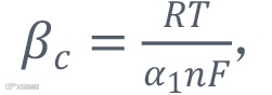 这个方程被称之为腐蚀基本方程,具有简洁对称美。式中icorr和Ecorr为自腐蚀电流和自腐蚀电位,其物理意义为没有外加极化电位时,腐蚀电极阴极反应和阳极反应耦合电流大小相等时的电流及其对应的电位。腐蚀方程是腐蚀电化学测试与分析的基础,特别是极化曲线的解析,可以快速获得icorr,进而快速得到实时腐蚀速率信息,但该基本方程只是形式上与Butler-Volmer方程具有相似性,实质是两个反应耦合后的动力学方程(没有平衡态),而Butler-Volmer则表达的是一个电化学反应(严格讲要求是基元反应)的氧化和还原两个方向(存在平衡态)。必须明确的是:腐蚀方程作为极化曲线和电化学阻抗谱等腐蚀电化学测试分析的基础,但实际是建立在多步假设的基础上得到的,特别是关于极化电位的要求,以及对表面浓度的简单处理,这通常与实际情况并不符合。另外特别注意a1与a2并不相等,因这两个传递系数分别对应两个不同的电化学反应。已有文献报道传递系数介于0.1至0.9,这可能是腐蚀测试中Tafel斜率高达几百mV/dec的原因。