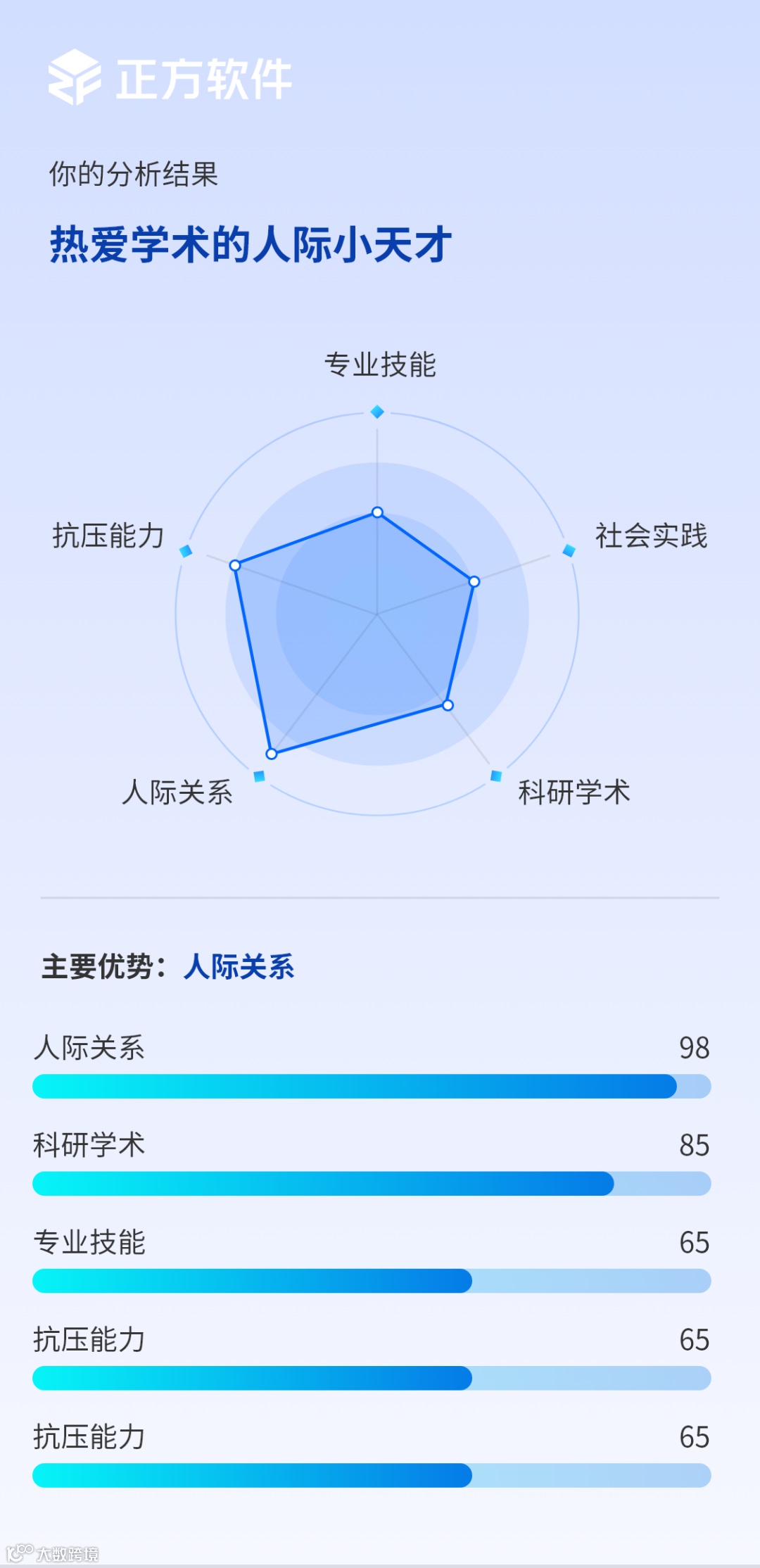 学习生涯塑造了你独特的竞争力。基于专业技能、科研成果、社会实践、社交能力、抗压韧性等多个核心维度构建的多维竞争力分析模型能深入挖掘你在各项活动中的表现,精准量化你的能力水平。报告将清晰地展现你的每一个闪光点,让你对自己的优势一目了然。它将是你求职、深造、乃至未来职业规划的得力助手,助你自信迈向人生新阶段!