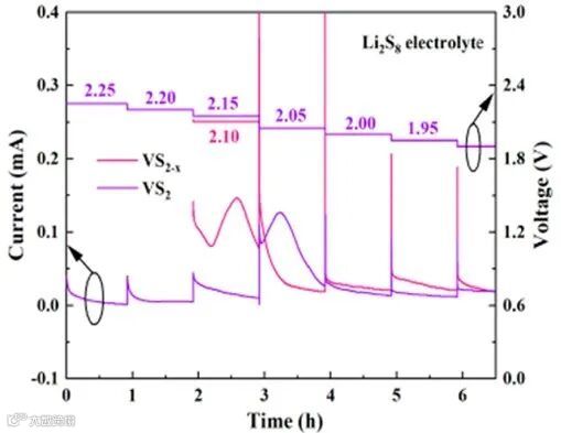 恒电位间歇滴定法(PITT)可用来研究Li2S的实际沉积电位,从测试结果可以看出Li2S在VS2-x中的沉积电位2.10V要高于其在VS2电极中沉积电位2.05V,说明VS2-x电极较VS2具有更好的“液-固”转化电催化反应活性。