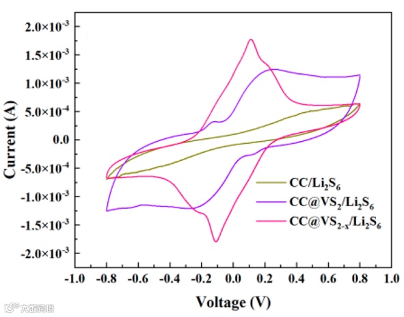 从测试的CV曲线中可以看出,CC/Li2S6仅表现出电容行为,无明显的氧化物还原峰,这是因为纯CC的催化活性位点较少,对Li2S6的亲和力不够,Li2S6无法与CC形成充分电接触而参与电化学反应所致。然而,在CC@VS2和CC@VS2-x电极CV曲线中,氧化还原特征明显,峰形突出,说明在CC@VS2和CC@VS2-x的作用下,Li2S6的电化学转化反应得以顺利进行。另外,CC@VS2-x电极的峰值电流为1.75mA,高于CC@VS2电极的1.25mA,意味着在CC@VS2-x电池中多硫化锂的转化更容易、更充分,印证了CC@VS2和CC@VS2-x对促进可溶性多硫化锂转化的催化作用,说明含有S空位的CC@VS2-x的电催化活性更佳。
