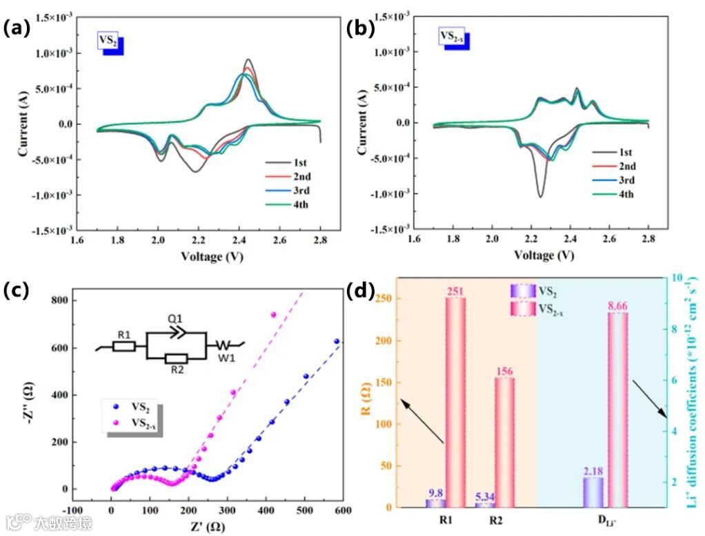 图3 (a) VS2和(b) VS2-x的在电压区间1.7~2.8V,扫描速率0.1 mV·s-1条件下前四圈循环的CV曲线;(c) VS2和VS2-X电极在0.01Hz~100kHz扫频模式下的EIS奈奎斯特图和对应的等效电路图;(d) VS2和VS2-x电极的阻抗值和Li+扩散系数对比。