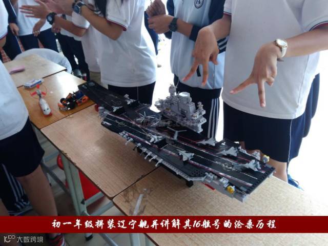 初一级组织各班对我国现有和将来的航母战斗群进行网络调查,并进行航母战斗群积木拼装,了解其战斗序列等知识形成报告。并在正则楼架空层中进行航母战斗群积木展示,各班分别组织同学对自己的积木作品进行现场讲解,让许多同学了解到辽宁舰舷号16的来历,树立起科技兴国的决心。