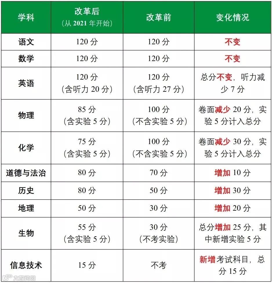 所考科目、具体科目分值做了调整,最大的调整是增加了考试新科目,信息技术,分值15分。
