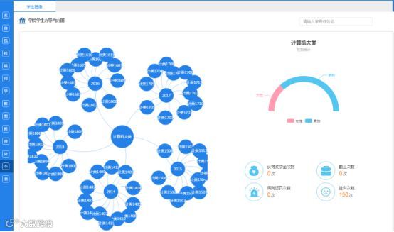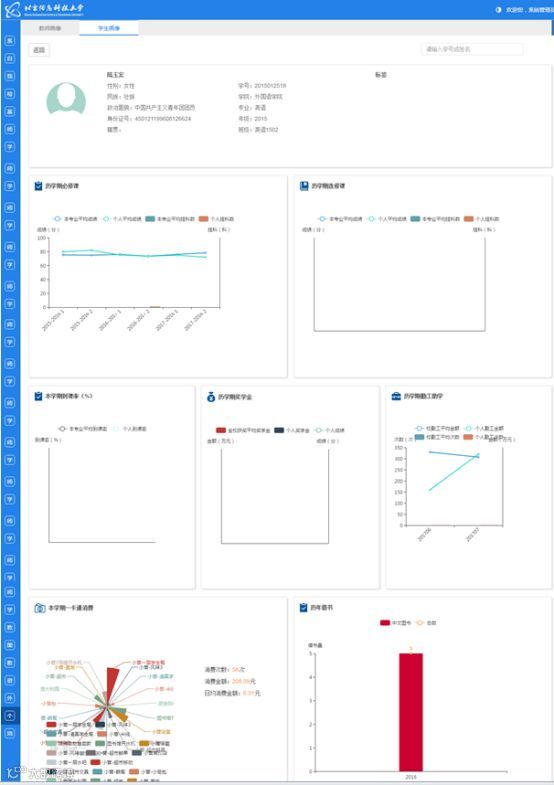 展示学校专业大类下各年级段包含的班级信息,并统计整个专业大类中的男女生比例、奖学金次数、勤工次数、惩罚次数以及挂科次数等信息,可以下钻到下一级精确定位到班级个人,直观展示某个学生的必修课/选修课完成情况、到课率、历学期奖学金、历学期勤工助学、一卡通消费、书籍借阅等统计数据。