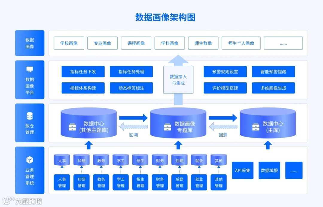 数据画像平台具备多来源数据采集、统一指标管理、标签动态生成、多主题模型搭建、多维画像生成,以及智能预警等功能于一体,助力高校实现全域全场景的数据价值挖掘,赋能高校数字化运营。
