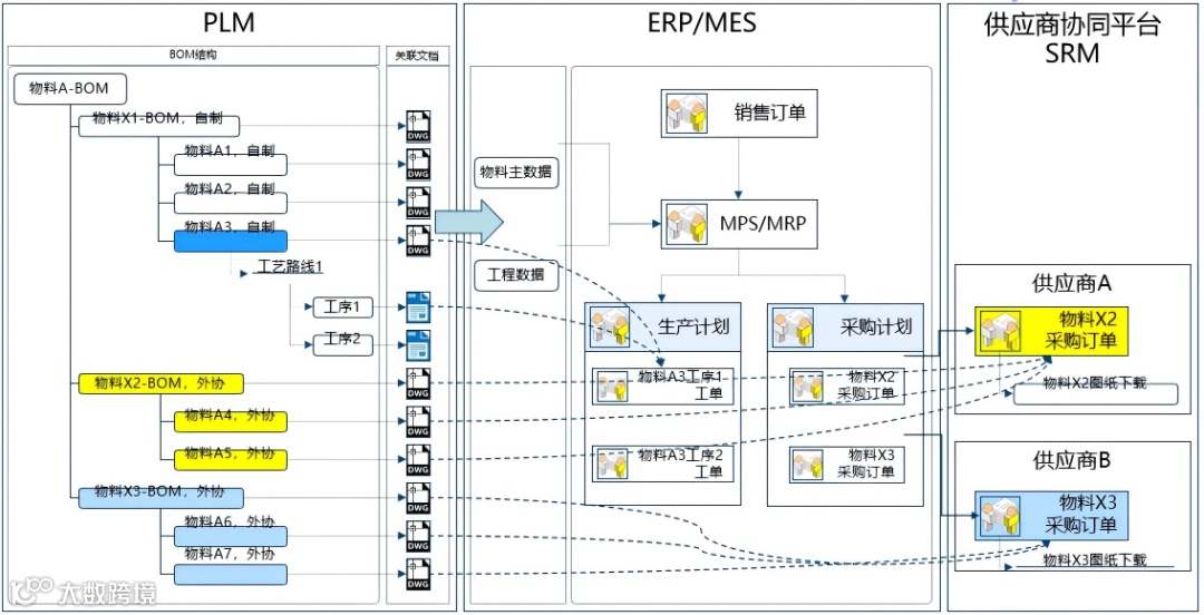 金蝶云·星空首创国内PLM-ERP-MES-SRM一体化平台,通过BOM全生命周期管理,可联动研、产、采三边业务,实现真正的设计、生产 、采购动态协同,解决了产品数据前端与后端业务系统“脱节”问题,PLM前端产品数据可作为ERP、MES、SRM等系统的数据源头,打通企业数据链条,保障数据源唯一,确保业务链资料调用准确高效、流程执行顺畅。