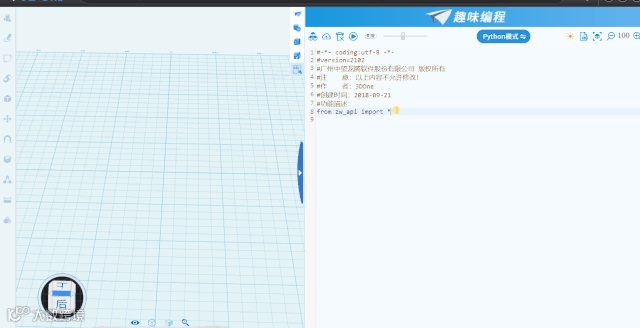 Python模式,它是用Python语言来完成3D设计模型,且是行业首创支持与积木编程模块相互切换,编写困难的地方先用积木编程再一键切换为Python编程,大大降低了学习 Python编程的难度。另一方面,熟悉编程的创客们,当你完成Python编程想要向大家展示自己成果时候,也可以使用一键切换功能进行两种编程模式的快速切换,将python 脚本转为积木拼接方式,将自己编程的逻辑清晰展示!