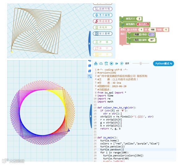 除了两种编程模式,3D One2.6版本新增的海龟库设计也是一大热门点。白宗钦老师称赞它“简单语言可以变出多样图形”。利用海龟库,只需要几句代码,配搭一些数学知识,便可控制画笔移动绘制出丰富酷炫的图案。海龟库,让你像画画一样的学习编程,怎能不好玩,怎能不容易掌握编程技能呢~