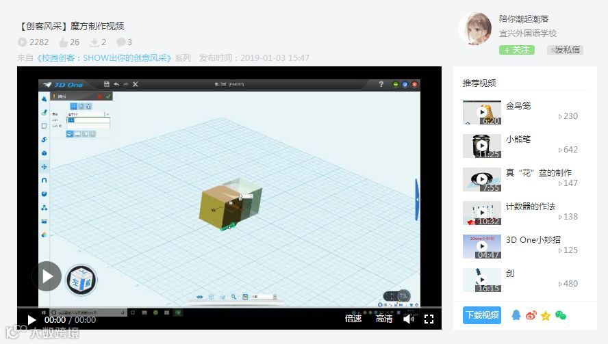 i3DOne社区内的大部分同学都是作为一个学习者,尹添一同学却不同。除了作为学习者,他还是一个“小老师”。他乐于将自己的3D模型制作过程公开,在提高自己的能力的同时,也帮助社区的小伙伴一同进步。他录制的《魔方制作视频》内容流畅、讲解细致,教会了许多小伙伴制作3D魔方。而且,《魔方制作视频》还被收纳进了社区的视频专辑《校园创客:SHOW出你的创意风采》,展现出尹同学别样的创客风采。