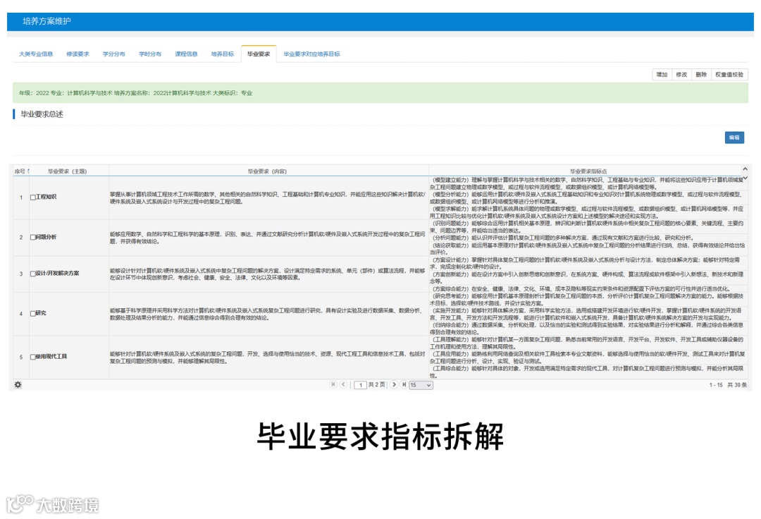 专业负责人需制定培养方案,设定学生毕业要求(及细分指标)、培养目标、各学期开设课程等信息,系统将毕业要求与培养目标和课程进行对应。