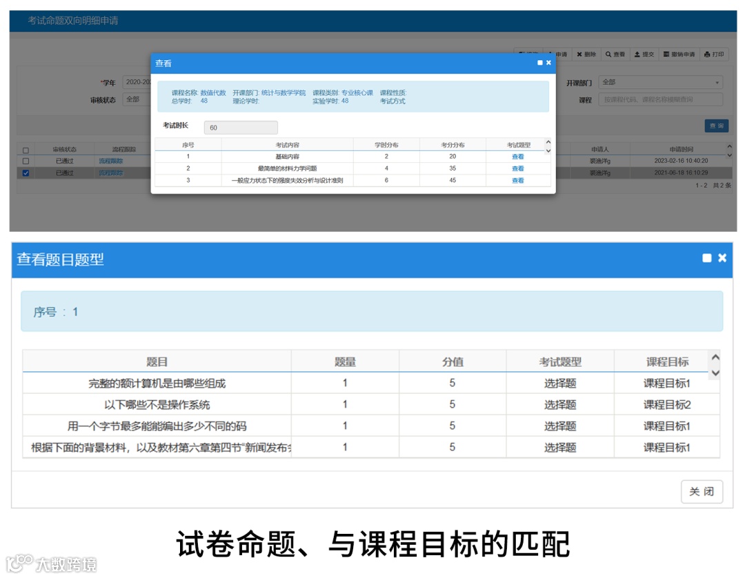 课程负责人需进行试卷命题,维护课程考试时长、题型、题量、题目内容、分值,特别是对不同题型和对应课程具体目标进行匹配。