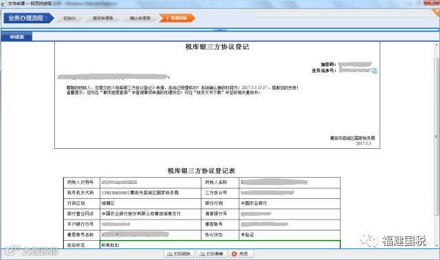 纳税人可将该协议书打印出来并加盖公章,然后持协议书至开户银行进行确认信息。开户银行审核办理,银行将两份协议书加盖银行业务印章后将其中一份协议书交给纳税人,另一份自行留存。纳税人登录网厅,进行税库银三方协议验证。